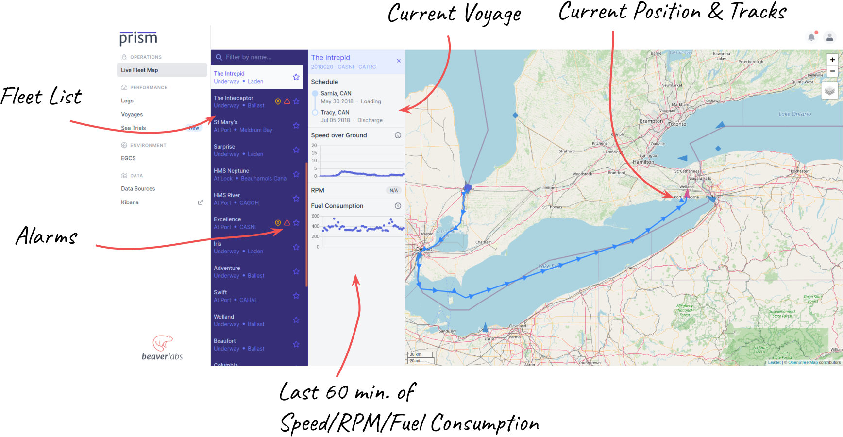 Prism is an online data analytics platform tailored for ship owners and ship operators. It provides a live map of your fleet, automatically detects port calls and canal passages, breaks down voyages into legs using geo-fences, monitors fuel consumption and sends email notifications when anomalies are detected.